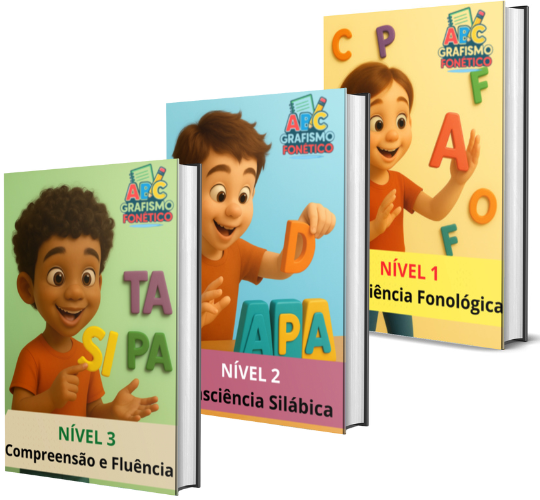 As apostilas do Grafismo Fonético conduzem a criança passo a passo na alfabetização. O Nível 1 trabalha o reconhecimento de letras e sons, o Nível 2 introduz sílabas simples de forma lúdica e o Nível 3 desenvolve a leitura com compreensão e fluência, formando frases curtas com mais segurança.